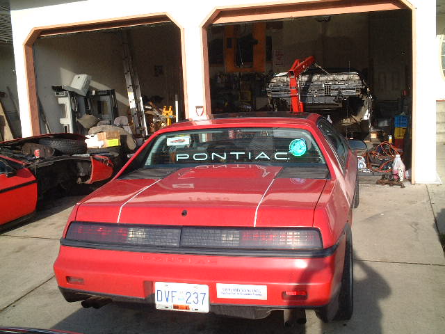 Ok well the title starts it out pretty well. Lisa (my girlfriend) bought this car about a year ago, at that time it was a pretty much stocker used car. With Very High Mileage, over 300,000kms that is around 200,000 miles on it. The previous owner was a car alarm and stereo installer and used it as his work vehicle. So you can imagine the shape of the interior when she got it. The dash corners were not only just broken the entire passenger side corner was gone, due to his tool box being tossed in and out of the car. Electrically the car was very sound. He had installed an alarm and stereo system with all the bells and whistles. Keyless entry, Keyless Trunk, Extended range remote pad with antenna, only thing it did not have was remote start. The stereo had Kenwood 4x10's in the dash with a top line head unit and 10 disk CD stacker behind the passenger seat. We had been looking for a fiero for Lisa for quite some time, we knew that with my garage full of spare parts and a bit of time we could get a fixer upper and have fun with it. This was just the car we wanted. The seller let us have it for 1200$ and included a set of 86GT Lace Wheels. With the extremely high KM it needed a bunch of suspension work but drove nice for what it was. 2 weeks after getting the car, she drove it into the driveway with a ROD KNOCK!!!! After a few min of cursing the car for breaking, I told her to pull it into the garage and we proceeded to pull the motor. (Yes she helped) It just so happened that I had bought an 86SE V6 parts car, that had been rebuilt and then 2 weeks later, ran head long into a telephone pole at 50mph. The 86 had a rebuilt V6 with what we think is a mild cam installed. It took some time and a few friends coming over to help get it all done, but the car was back on the road and running real strong.